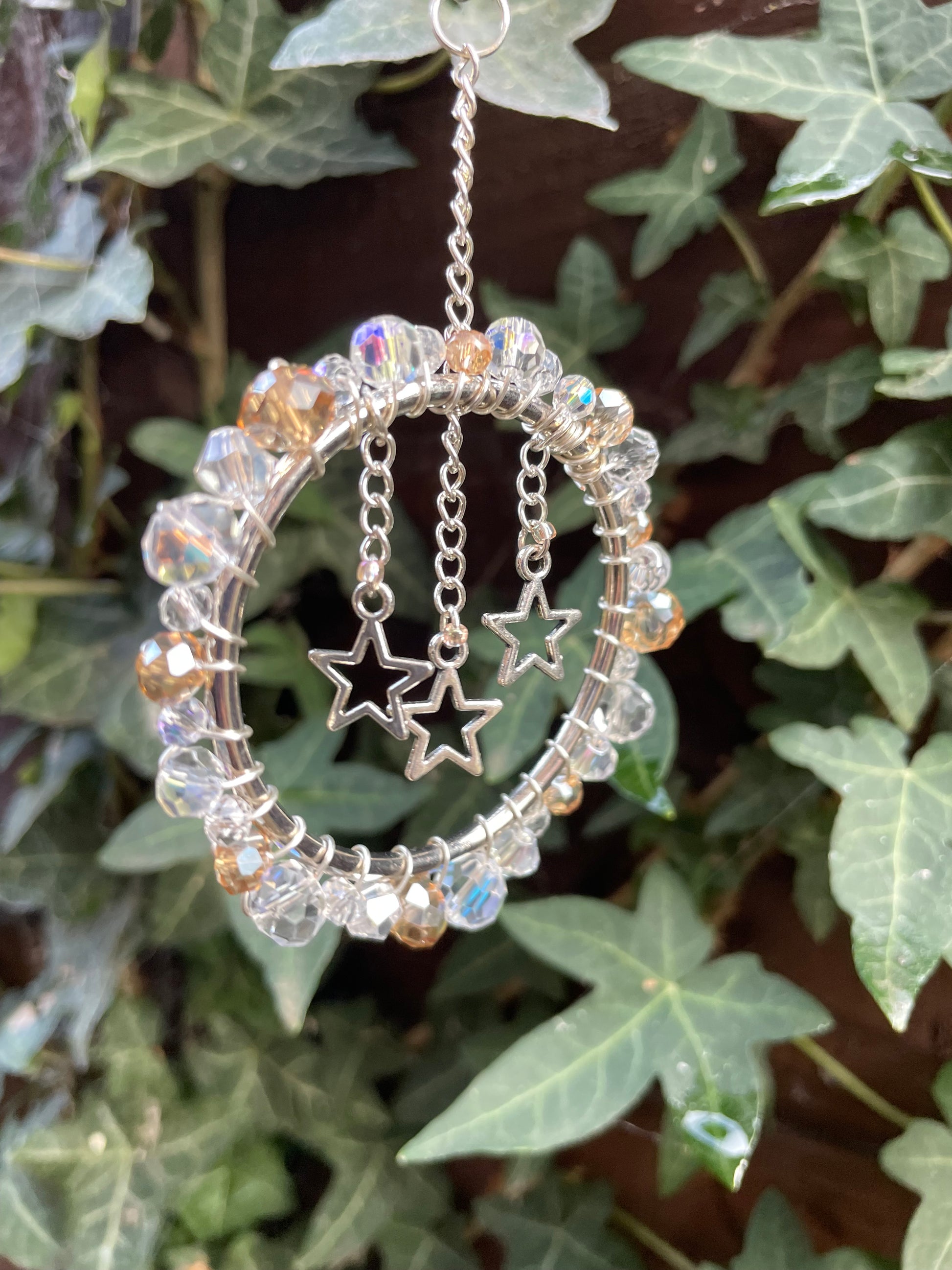 - Interspersed among the crystal beads are warm amber or golden-toned beads, adding a rich, inviting glow to the decoration.